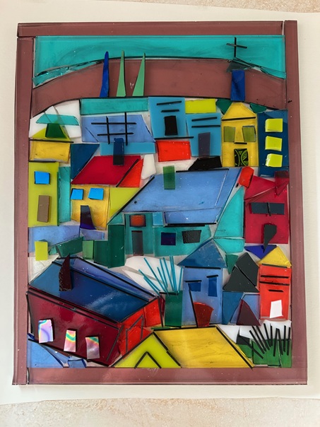 Alison Lowe's latest venture is fused glass. Cutting and cooking glass pieces requires a whole new take on an unfamiliar medium. The onsite glass kiln is working full time, and the magic happens overnight at 804 degrees Celsius. The carefully cut and arranged glass pieces melt and become a sculpture in relief.